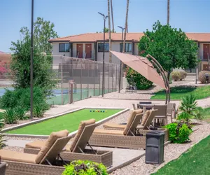 Our community features a gorgeous, large outdoor community space with a fireplace, abundant seating, bocce ball and other outdoor lawn games; 3 grilling stations, heated pool and hot tub, additional seating areas and misters for those warm Arizona days.