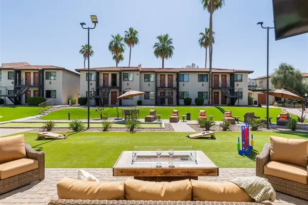Our community features a gorgeous, large outdoor community space with a fireplace, abundant seating, bocce ball and other outdoor lawn games; 3 grilling stations, heated pool and hot tub, additional seating areas and misters for those warm Arizona days.