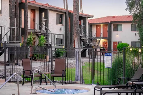 Our community features a gorgeous, large outdoor community space with a fireplace, abundant seating, bocce ball and other outdoor lawn games; 3 grilling stations, heated pool and hot tub, additional seating areas and misters for those warm Arizona days.
