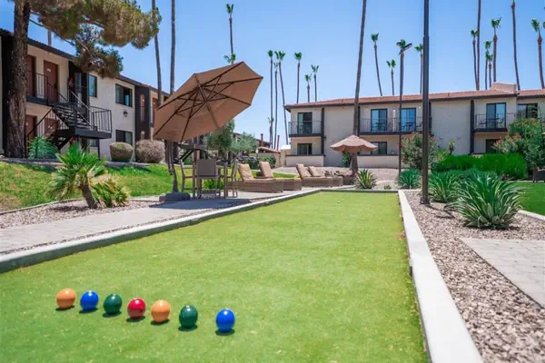 Our community features a gorgeous, large outdoor community space with a fireplace, abundant seating, bocce ball and other outdoor lawn games; 3 grilling stations, heated pool and hot tub, additional seating areas and misters for those warm Arizona days.