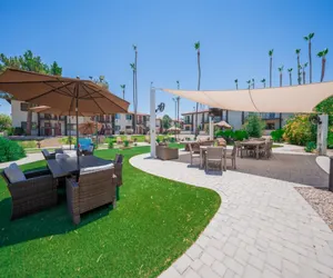 Our community features a gorgeous, large outdoor community space with a fireplace, abundant seating, bocce ball and other outdoor lawn games; 3 grilling stations, heated pool and hot tub, additional seating areas and misters for those warm Arizona days.
