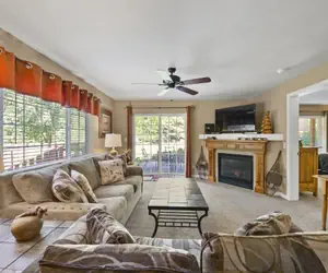 Inside, discover a spacious living room adorned with a flat screen TV, a cozy gas fireplace, and a private porch with a propane grill -- the perfect setting for family gatherings and memorable evenings. The well-stocked kitchen stands ready to inspire culinary creations and delightful family meals.