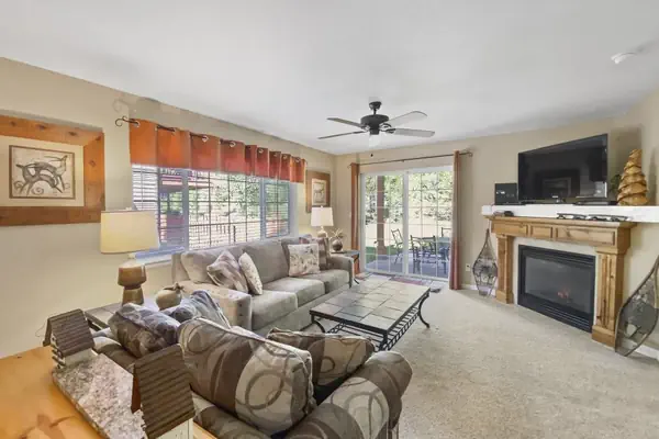 -- Living Room: Gas fireplace, flat screen TV, queen sleeper sofa