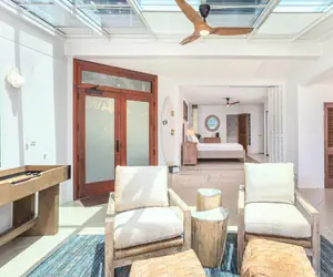 The condo has two bedrooms. The master suite opens to the atrium with ocean views from bed. There is an en-suite bathroom with a walk-in shower and a Japanese plunge tub. The master-suite is air-conditioned as well as the main living area. The second bedroom has a queen-sized bed and a garden view. This room does not have A/C but there is a ceiling fan and stand fan that keeps it nice and cool. There is one other full bathroom. The unit also includes a full-sized washer and dryer for guest use.