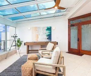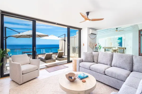 Once inside this immaculate condo, you're welcomed by a gorgeous covered atrium with a comfortable, modern seating area. Use the binoculars to spot whales or watch surfers tow into big waves during the winter. There is another living room with an HD Smart-TV equipped with cable. In addition, there is high-speed internet throughout the unit. From the living room, step out onto your oversized lanai and take in the stunning sunsets over the Pacific. The lanai also has a covered dining table as well as a propane grill for outdoor dining.