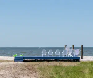 A shaded deck will give great views of our happy hump (bridge) and beautiful sunsets on the bay. Private beach in your back yard with bayside deck, hammocks, and furniture.