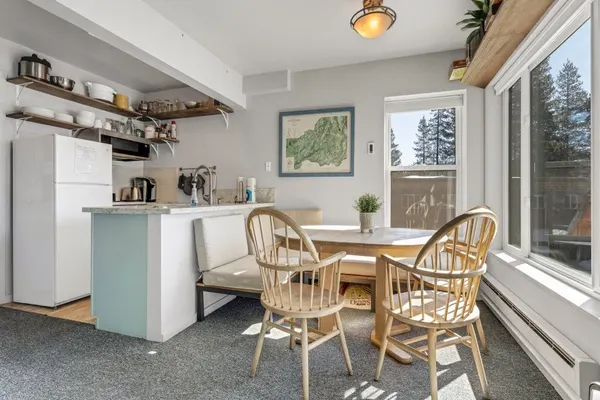 Updated and remodeled corner unit. This two bedroom, one bathroom condo is a corner unit with extra windows making it bright and cheery. The living room has a pellet stove for extra heat on those cold winter nights and the furniture is Lovesac, which is known for being comfortable and chic. The first floor has a galley kitchen, dining area with bench seating and living area. Upstairs there are two bedrooms and also a bath /shower separate vanity.area for dressing. The upstairs bedrooms contain a queen bed in one room and a queen/twin bunk in the other with a full size bed on the bottom. Neatly decorated and in a great location.