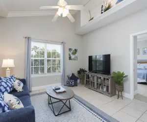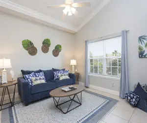 This second floor condo has a wonderfully decorated living room which offer ample seating room for guests to relax, socialize, and watch the flat screen tv. This couch in the living room pulls out to a sleeper sofa for additional sleeping space. The coastal decor in this condo is a must see!
