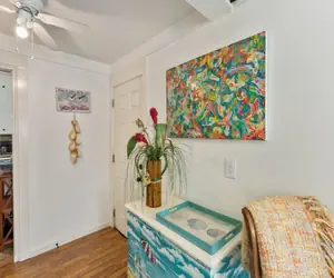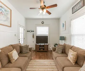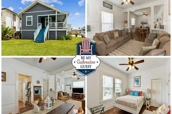 Tina Marie is located in-town Galveston at 1726- 19th Street, just 1 block to Seawall beach, approx 6 blocks to the Pleasure Pier, a minutes drive to the Strand and from the front porch you can see the sea! 2 bedrooms, 1 bath, plus a bonus room sleeping 8 comfortably in beds! The property features 1058 sq ft of hardwood floors, cable TV, WiFi, stacked washer/ dryer, charcoal grill, outdoor shower and an off street parking spot! Tina Marie gives you that cozy and comfortable feeling from the moment you enter - the living area flows into the dining where the bedrooms, bathroom and kitchen are branched off of. The front bedroom has a full size bed, a bunk and cable TV. The middle bedroom offers a queen bed, a twin chair/bed and cable TV. The bonus room has a twin bed, cable TV, washer/dryer and a back door that leads to the outdoor shower and off-street parking spot. The bathroom is situated between the dining area and 2nd bathroom offers a walk-in shower. Tina Marie is a relaxed cottage and conveniently located which makes for a happy stay!