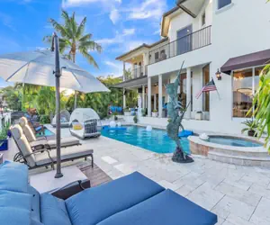 This luxury Mediterranean-style home has 26' high hand-painted dome ceilings in Ft. Lauderdale with 5 gorgeous bedrooms and private ensuite bathrooms ready for up to 10 guests. A vacation at this home will elevate you and your guests to celebrity-level amenities, including a private boat dock on the Intracoastal Waterway canal. Within a few blocks are the white sand beaches for which Florida is famous.Step into the grand entrance of this modern-designed, appealing color pallet with meticulously planned elements and experience ultimate comfort to retreat from it all. The design features include chandeliers, custom lighting, a jetted bathtub, and large comfortable furniture throughout - not one detail has been left out of this stunning home.The gourmet kitchen will call your name and spark your inner chef prompting you to stay in for the evening and celebrate together. A restaurant-style gas stove and oven, gorgeous granite countertops, island sink prep, and nearly every kitchen appliance to bring your guests closer - either in the formal dining area or out on the private balcony overlooking the water. Pure bliss.Many entertainment options included with the property:Poker tableBicyclesHome theater with surround soundBook library and home officeA day out on your private balcony:Indoor/outdoor living space with big screen televisionResort-style heated/chilled saltwater pool and spaCabana style seatingPool accessories and LED party lightsTiki Torch lightingBuilt-in outdoor gas barbequeStunning Mediterranean style PergolaIf you choose to head out for adventure or a meal, here are a few highly recommended regional options:Shooters Waterfront restaurantBlue Moon Fish Company restaurantKaluz restaurantTakato restaurantMoorea restaurantBokampers Sports bar and restaurantMastro's restaurantSea Watch on the Ocean restaurantRiver Boat SiteSeeing CruisesMini Powerboat RentalsChampagne Sunset CruisesFt. Lauderdale Sailing CharterBayview City park is 7+ acres with tennis, pickleball, basketball, baseball diamonds, playgrounds, etc., across the street.Galleria Mall is 3.5 miles away.Los Olas Boulevard is 6 miles away.Many top golf courses are very close.* Early Check In / Late Check Out will be considered upon availability and is subject to extra fees.* Boat Dock with power and water – additional fee of $38.00 per foot per day (+processing fee). Electrical service is 30AMP. Boat size max is 60'. Please coordinate your boat/yacht details immediately after reserving the dates. Payment should be processed immediately via Redawning.* Pool Heat available for an additional $150 plus tax per night (+ processing fee) for the duration of the stay.* Stay in Guests are strictly maxed to 10 people.*Smoke detectors are installed throughout the property.Strictly No Pets allowed. Penalty applies. STRICTLY NO LOUD PARTIES ALLOWED. Penalty fees will apply if rule is not followed.