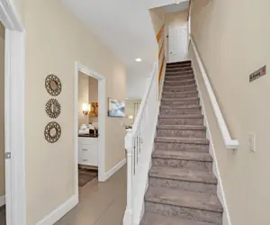 The second bedroom on the second floor offers twin beds. The bathroom has a tub/shower, sink, and toilet. The third bedroom is located on the first floor and features a queen bed. This room has direct access to a full bathroom with a shower, sink, and toilet. Hairdryers are provided.
