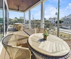 The gourmet kitchen and living room epitomize the ultimate vacation experience, boasting top-of-the-line appliances and generous seating to make you the perfect host. Summer Wind is further enhanced by an elevator, oversized porch spaces on each level, including a spectacular sun deck on the fourth floor with cypress trusses, an expansive pool and hot tub area at the front of the house illuminated by lights and a custom waterfall feature, an outdoor grill space, and enclosed by a brick and masonry fence that complements the exterior.