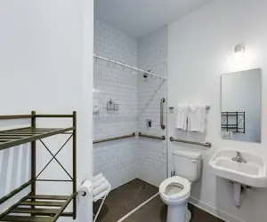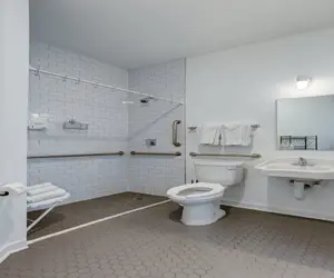 Unique space set up to be ADA accessible with wide walkways, step-free shower, bathroom grab bars, and open space beneath the sink!