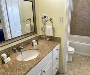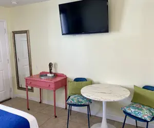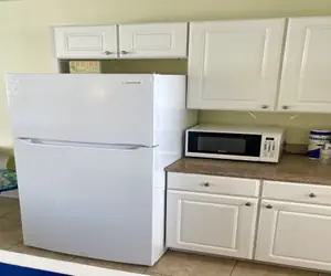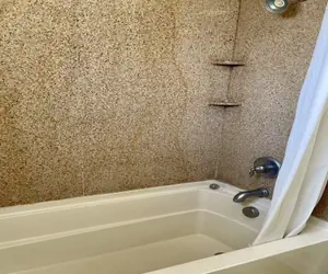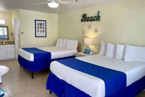 Completed in June of 2006, this motel room comes with 2 queen beds, a small table with 2 chairs, microwave, toaster, coffee pot, refrigerator with small freezer, and granite countertops. The bathroom has granite surrounds and a shower/tub.