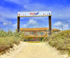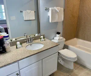 The 1 bedroom 1 bath motel unit had a queen bed, TV, and a bathroom with granite counters and bathtub surround.
