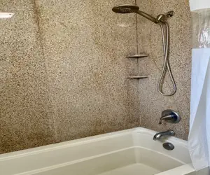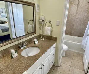 The bathroom has granite surrounds and a shower/tub.