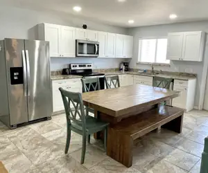 There is a full size fully equipped kitchen and dining table.