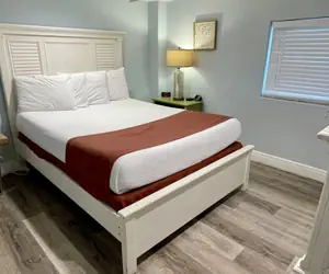 It has a queen bed in the bedroom with 2 sleeper sofas in the living room.