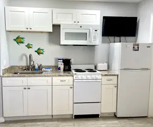 This 2 bedroom 2 bath motel efficiency unit has 2 queen beds. The 1st bedroom has a refrigerator, coffee pot, microwave, toaster, and a small oven/4 burner range.