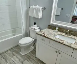The other bedroom has the queen bed, microwave, toaster, coffee pot, and a mini fridge. It also has a small seating area.