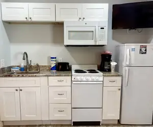 One of the bedrooms has the queen bed, refrigerator, coffee pot, microwave, toaster, and a small oven/4 burner range.