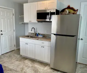 • This 2 bedroom 2 bath motel efficiency unit has 2 queen beds. The 1st bedroom has a refrigerator, coffee pot, microwave, toaster, and a small oven/4 burner range.