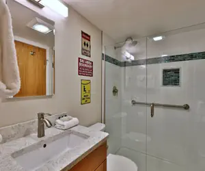 Our small studio with one bathroom Fall Line condo in Killington, Vermont is located close to the slopes and the perfect place for your vacation no matter the season. This lock-off unit is perfect for up to two people with sleeping on one queen bed and featuring an ensuite bathroom. If you need more space, you can book the connecting condo next door and gain two more bedrooms and bathrooms. The community center at the center of the complex offers an indoor pool, hot tub, sauna and small fitness area. Come see why Fall Line is one of the best locations in Killington! (NOTE: This is only one room with a bathroom. There is no kitchen or living space.)
