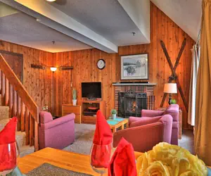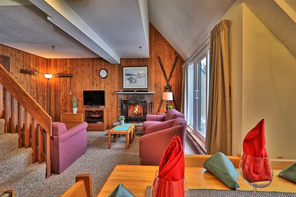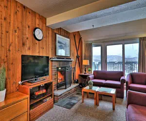 Our large condo has three bedrooms and two bathrooms on two floors with sleeping for up to ten guests (2 in the master bedroom queen, 3-4 in the second bedroom with full/full bunk and twin bed, 3-4 in the third bedroom with full/full bunk and twin bed, plus two on the living room sofa bed). You'll have plenty of space with lots of room to spread out and enjoy the mountain views from the living room and bedrooms.
