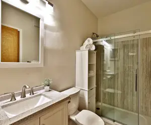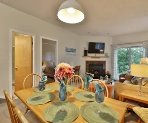 When you walk in through the front door, you'll find ski storage and the secondary bedroom with full bed and ensuite bathroom to your right. The fully equipped open kitchen, dining room and living room are straight ahead where you'll find everything you could need to stay in and prepare a meal for the family, relax by the fire or catch a show. The primary bedroom is just off the living room and features an ensuite bathroom with king bed. The living room features a flat screen TV, small desk, fireplace, patio access and sofa bed.