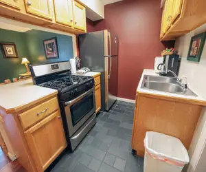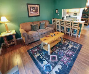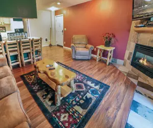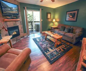 Offering a full kitchen and personal hot tub, Unit 297 is a 1-bedroom, 1-bath condo with a deck overlooking Fall River and the Rocky Mountains.