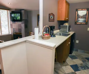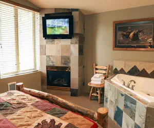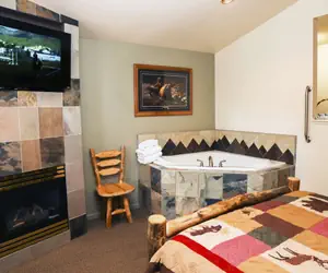 Overlook Fall River and the Rocky Mountains from the patio of cozy Unit 101. This ¾-bath suite with kitchenette features its own two-person jetted tub and gas grill with table and chairs. Enjoy an evening in front of the gas fireplace on a queen-size bed with cable TV and free DVD movie rentals or explore downtown shopping and dining five minutes from your door. Rocky Mountain National Park rests one mile away and your stay includes a heated pool and on-site fishing in the summer with complimentary snowshoe rentals during the winter. Free Wi-Fi. Sleeps two.