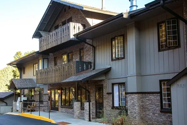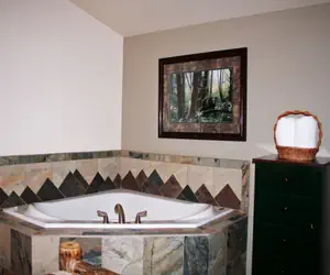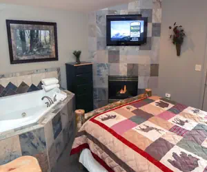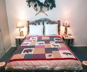 Overlook Fall River and the Rocky Mountains from the patio of cozy Unit 106. This ¾-bath suite with kitchenette features its own two-person jetted tub and gas grill with table and chairs. Enjoy an evening in front of the gas fireplace on a queen-size bed with cable TV and free DVD movie rentals or explore downtown shopping and dining five minutes from your door. Rocky Mountain National Park rests one mile away and your stay includes a heated pool and on-site fishing in the summer with complimentary snowshoe rentals during the winter. Free Wi-Fi. Sleeps two.
