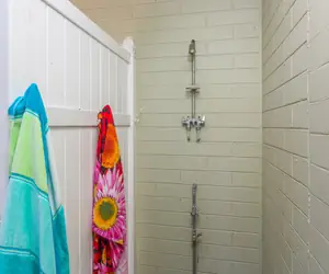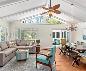 Cheery décor with vaulted ceiling and plenty of light in the living spaces, but cool and muted light in the bedrooms for sleeping.