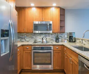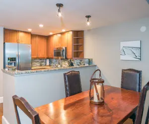 In the master bedroom on the main level, there is a king bed (can be set up as two twins) and a flat-screen TV with DVD player. The bath is accessible from the short hallway and has a jetted tub with a shower and large two-sink vanity. Also on the main level is the second bedroom with a king bed (can be made into two twins), flat-screen TV and DVD player. The bathroom is ensuite, with a shower only.