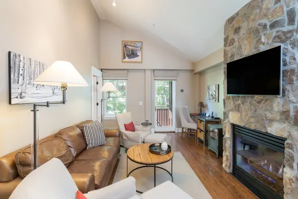 LAYOUT: This top-floor residence has natural hardwood floors with an open floorplan living room, dining area and kitchen. In the living room is a natural stone gas fireplace, wall-mounted flat-screen TV with DirecTV and a Blu-Ray DVD player. The leather sofa pulls out to a queen bed. Off the living room, the balcony opens to a river-side view. The dining table seats six with room to add bench seating. The kitchen is a fully equipped space with granite countertops, chef-quality appliances, and all the dishware, cookware and utensils needed for any Telluride vacation.