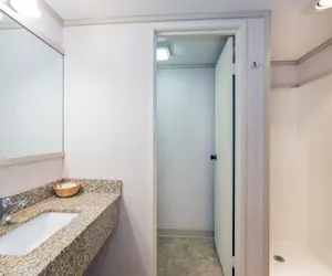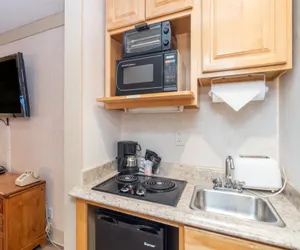 This room provides you with a two-burner cooktop, mini-fridge, microwave, toaster, coffee-maker, and the pans and dishes you need to complete any meal. The queen bed and twin bed are all in the same room. The bathroom has a large exterior vanity area and a step-in shower.