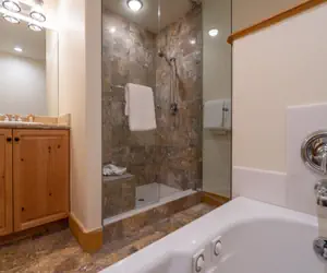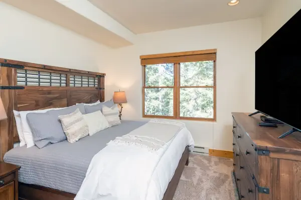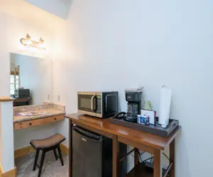 This lock-off room has a king bed, TV and an en suite bathroom with jetted tub and separate shower. Every unit at the Bear Creek Lodge includes a fan, humidifier, hairdryer, coffee maker, starter coffee, and robes.