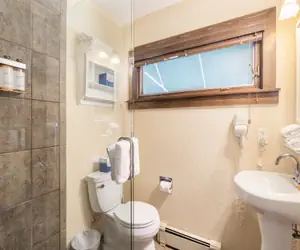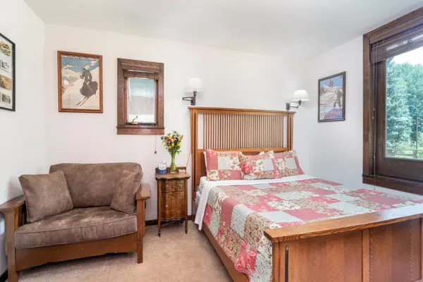 To access the Manitou Lodge, cross the footbridge located at the end of S. Fir Street. This hotel room is located on the ground floor of the lodge, closest to the front door. The room features a California king bed, a flatscreen TV, Roku, mini-fridge and a small lounge area. The private bathroom has a small pedestal sink and a step-in shower with a glass enclosure.