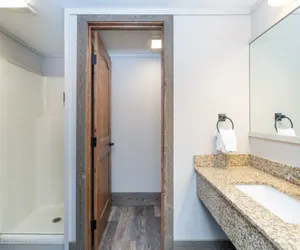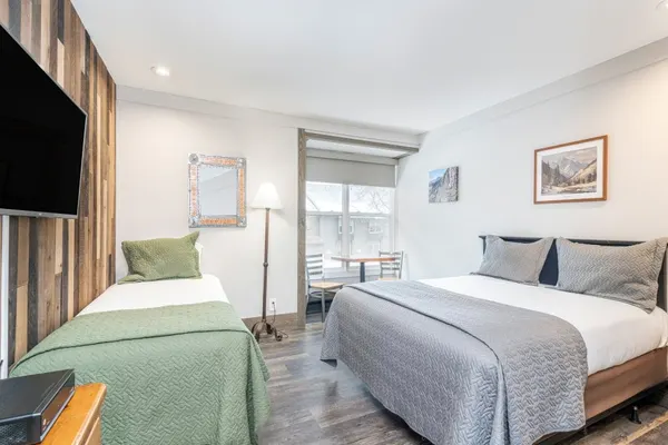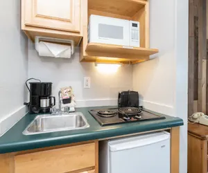 This kitchenette room provides you with a two-burner cooktop, mini-fridge, microwave, toaster, coffee-maker, and the pans and dishes you need to complete any meal. The queen bed and twin bed are all in the same room. The bathroom has a large exterior vanity area and a step-in shower.