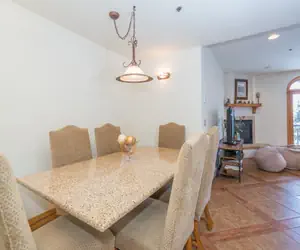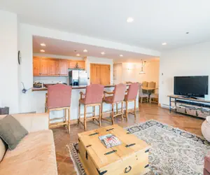 • Enter this condo on the second floor and walk into the main room with dining area with seating for six guests and living room with a gas fireplace, balcony with sunset view, and queen sleeper sofa. The living room is open to the full kitchen with granite countertops and a breakfast bar with seating.