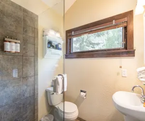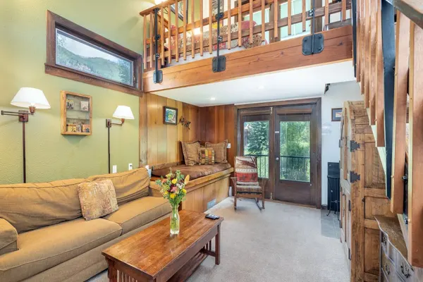To access the Manitou Lodge, guests cross the footbridge located at the end of S. Fir Street. This room is located on the second floor and has two levels. Guests enter the room and are welcomed into the living space, which has a queen sofa sleeper, flatscreen TV, Roku, mini-fridge, and small bench area. The french doors open up to a balcony that faces the San Miguel River. On this level, there is also a bathroom that has a step-in shower with a glass enclosure.