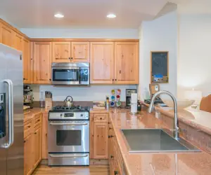 • Enter this condo on the second floor and walk into the open dining area with seating for six guests and living room with a gas fireplace, balcony facing the mountainside (forest view) and a queen sleeper sofa. The living room is open to the kitchen, which has granite countertops and a breakfast bar with seating.
