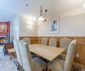 Enter this condo on the lobby level (third floor) and walk into the open dining area with seating for six guests and living room with a gas fireplace, balcony facing the mountainside (forest view) and queen sleeper sofa. Flat screen TV/DVD in the living room. The living room is open to the kitchen with granite countertops and breakfast bar with seating.