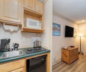 This kitchenette room provides you with a two-burner cooktop, mini-fridge, microwave, toaster, coffee-maker, and the pans and dishes you need to complete any meal. The bed can be made up as a king or two twins. The bathroom has a large exterior vanity area and a step-in shower.