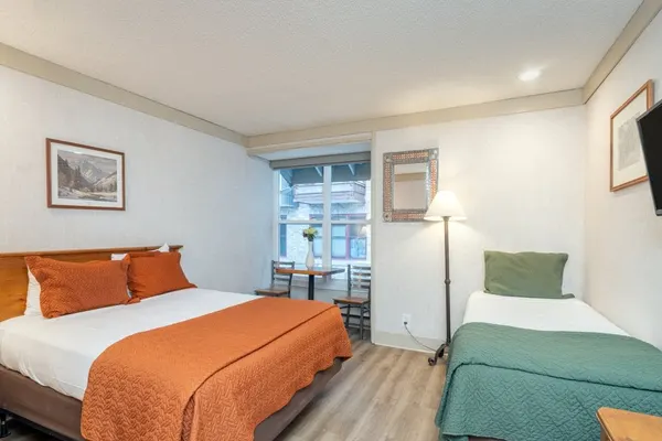 This kitchenette room provides you with a two-burner cooktop, mini-fridge, microwave, toaster, coffee-maker, and the pans and dishes you need to complete any meal. The queen bed and twin bed are all in the same room. The bathroom has a large exterior vanity area and a step-in shower.