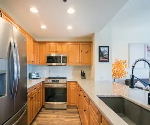 There is a bedroom near the entry that has a king bed, flat screen TV and large closet. A bathroom with a shower/tub combination is located in the hallway, as is the private stacked laundry. The second bedroom is located down the hallway and has a king bed, twin bunk beds, flat screen TV, microwave, coffeemaker and mini-fridge. The en suite bathroom has a step-in shower with a glass enclosure and a separate jetted tub. Every unit at the Bear Creek Lodge includes a fan, humidifier, hairdryer, coffee maker, starter coffee, and robes.