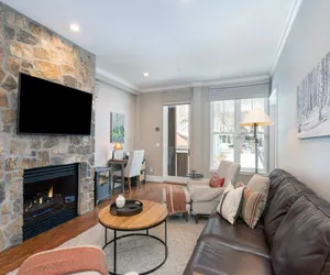 - In the living room is a natural stone gas fireplace, wall-mounted flat-screen TV with DirecTV and a Blu-Ray DVD player.