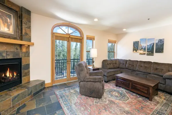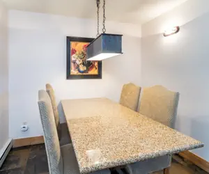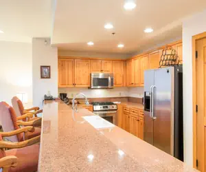 Enter this condo on the second floor and walk into the open dining area with seating for four guests and a living room with a flat screen TV, gas fireplace and a balcony with forest and mountain views. The living room is open to the full kitchen, which has granite countertops and a breakfast bar with seating.