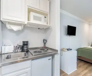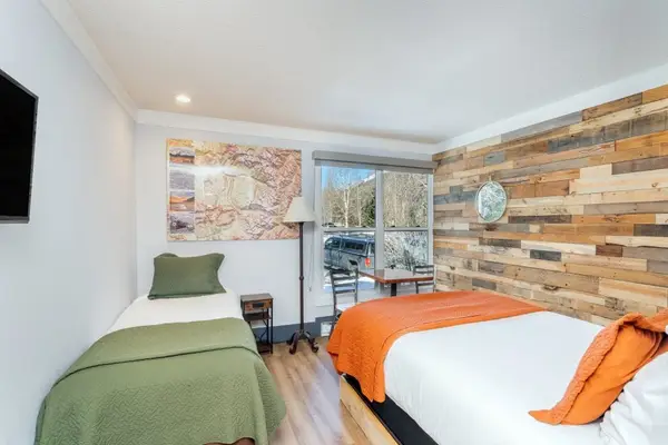 This is a hotel room with kitchenette (mini-fridge, microwave, two-burner stovetop, coffee maker and toaster) at the Mountainside Inn. This room has a queen bed and a twin bed and private bath with shower (no tub).