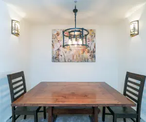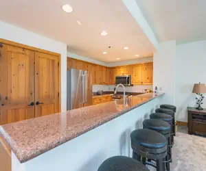 • Enter this condo on the third floor (Lobby Level) and walk into the open dining area with seating for six guests and living room with a gas fireplace, large flat screen TV, balcony facing the mountainside (forest view) and beautiful leather furniture and tasteful wilderness art. There is a sofa sleeper and the living room is open to the kitchen, which has granite countertops and a breakfast bar with seating.